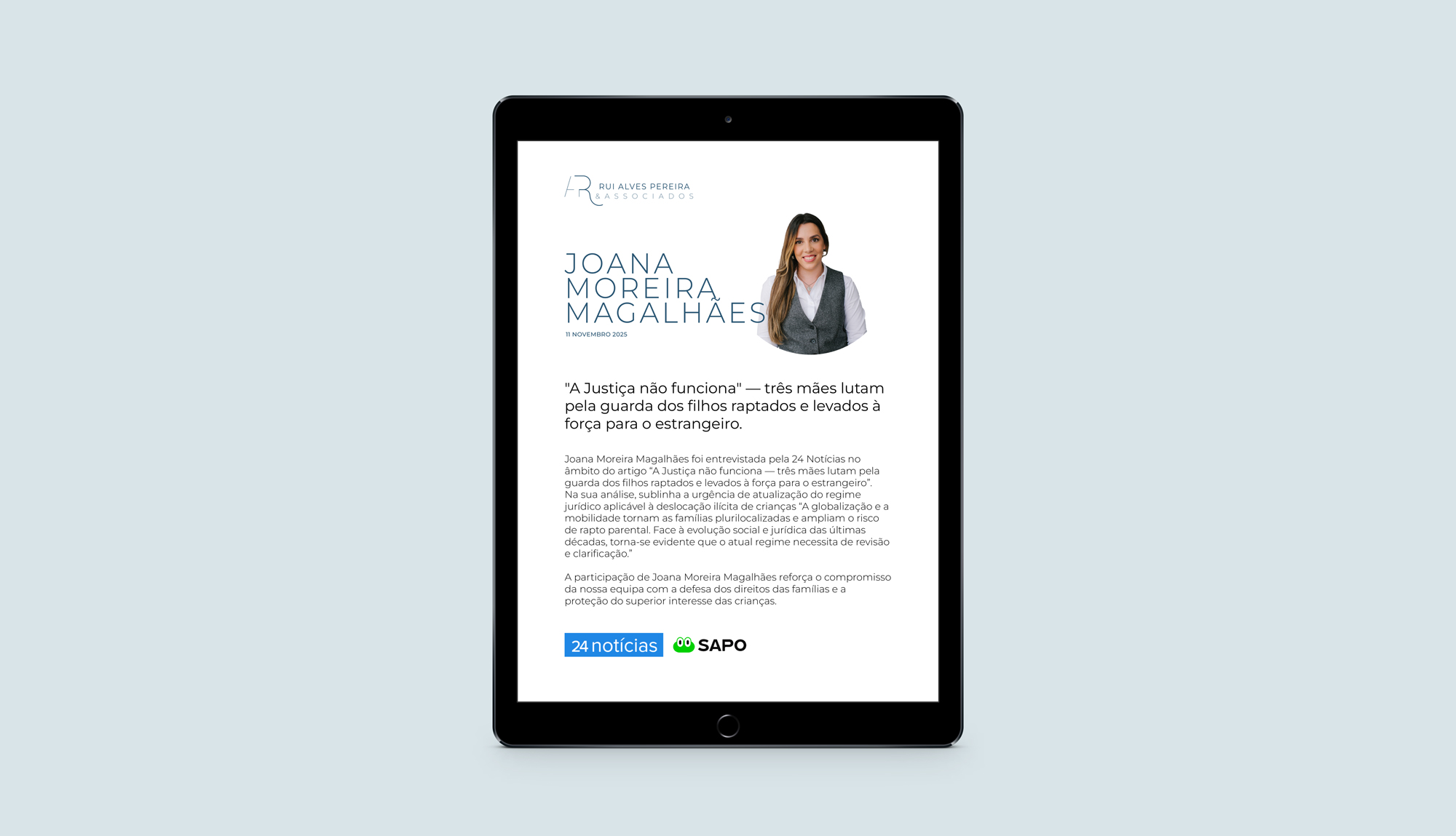 Joana Moreira Magalhães foi entrevistada pela 24 Notícias no âmbito do artigo “A Justiça não funciona — três mães lutam pela guarda dos filhos raptados e levados à força para o estrangeiro”. Na sua análise, sublinha a urgência de atualização do regime jurídico aplicável à deslocação ilícita de crianças “A globalização e a mobilidade tornam as famílias plurilocalizadas e ampliam o risco de rapto parental. Face à evolução social e jurídica das últimas décadas, torna-se evidente que o atual regime necessita de revisão e clarificação.” A participação de Joana Moreira Magalhães reforça o compromisso da nossa equipa com a defesa dos direitos das famílias e a proteção do superior interesse das crianças.